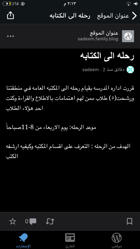 قررت اداره المدرسه بقيام رحله الى المكتبه العامه في منطقتنا ورشحت(٥) طلاب ممن لهم اهتمامات بالاطلاع والقراءة وكنت احد هؤلاء الطلاب موعد الرحله: يوم الاربعاء من 8-11صباحاً الهدف من الرحله : التعرفمتابعة قراءة “رحله الى الكتابه” - وجبات صحية في ليلة الأسبوع